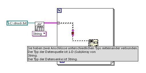 Naja da steht doch was der Fehler ist...du kriegst als Leseergebnis ein 2D-array aus Strings und machst mit der FOR-Schleife daraus n 1D-arrays von Tab-getrennten Strings...das versteht das VI halt nicht...