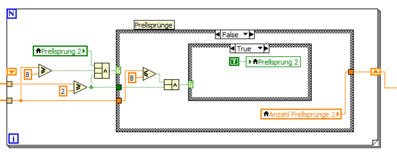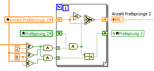 - wenn du das schon vorhandene Schieberegister auch benutzen würdest, bräuchtest du in der Schleife keinerlei lokale Variablen "Anzahl Prellsprünge 2" mehr!