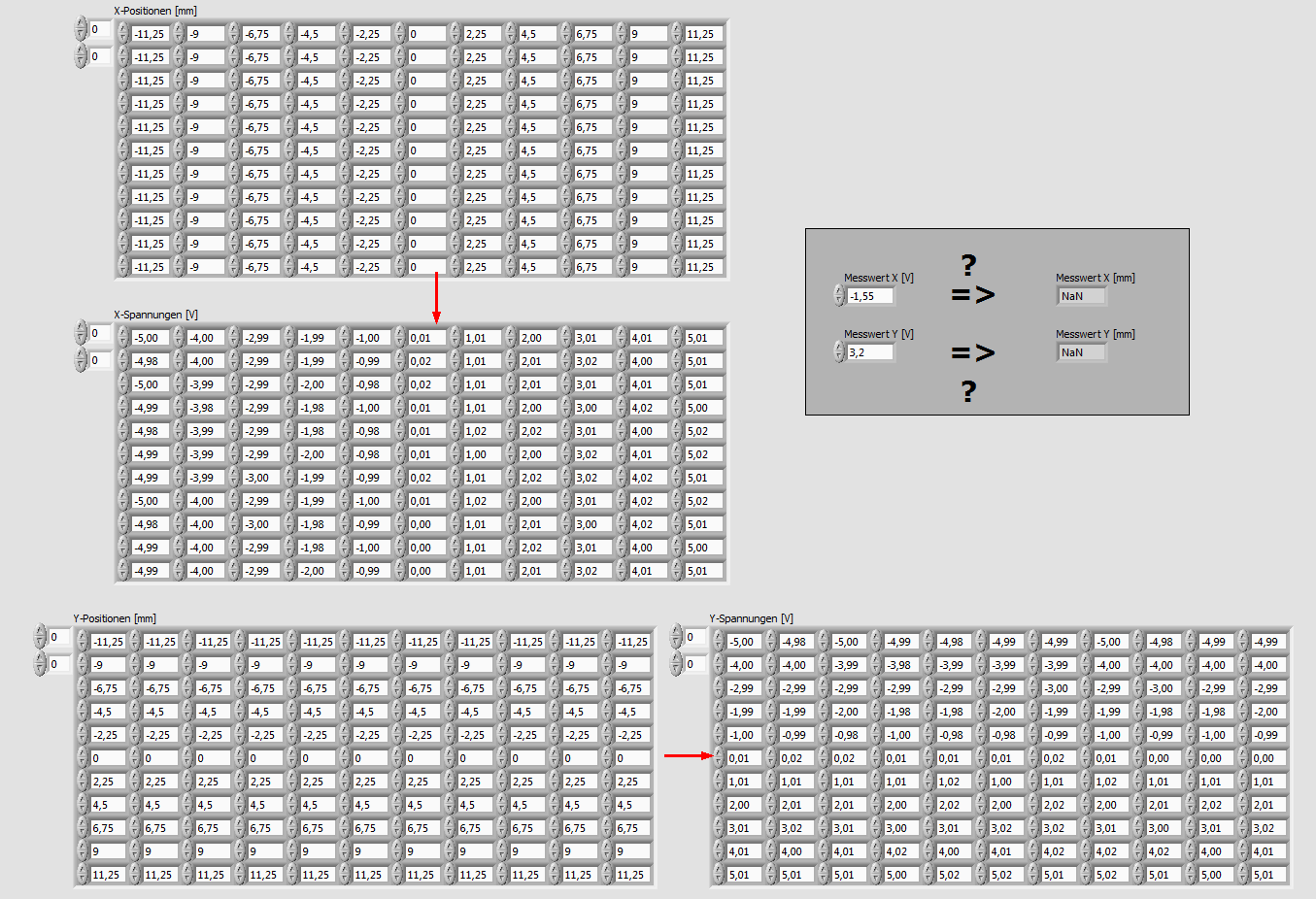 Weil das aber nicht linear verläuft, soll über eine Interpolation der konkreten X-Y-Spannungs-Messwerte anhand von zuvor erstellten "Look-Up-Tables" der Positionswert ermittelt werden. Dazu würde der bestrahlende Laser z.B. über eine genaue Positionierung um bekannte Werte entlang der X- bzw. Y-Richtung verschoben. Zu jedem Positionswert wäre dann ein Spannungswert verfügbar, wie folgende Tabellen beispielhaft zeigen: