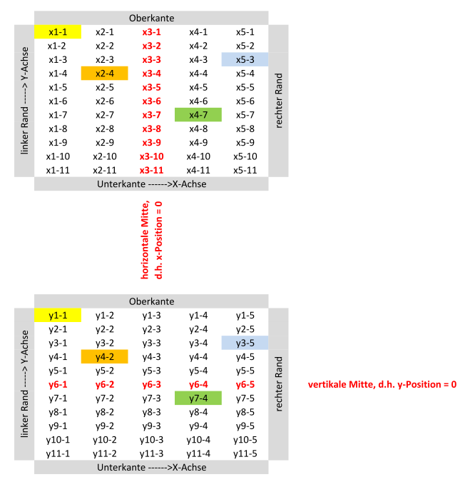 Ich hab hier nochmal ne kleine Tabelle gebastelt, die die Positionen auf der Sensoroberfläche angibt. Die roten Zahlen kennzeichnen jeweils die Mitte von X- und Y-Achse, d.h. auf der X-Achse werden in Richtung des rechten Rands positive Spannungen gemessen, in Richtung des linken Rands werden negative Spannungen gemessen. Genauso verhält es sich auf der Y-Achse, hier eben oben negativ, unten positiv. Das ist aber prinzipiell egal, es könnte auch zwischen null und Endwert gehen. Die zur Veranschaulichung farbig hinterlegten Felder gehören zusammen, d.h. das ist physikalisch die gleiche Stelle auf der Sensorfläche. Konnte ich das jetzt rüber bringen?