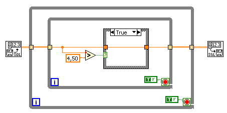 Dein Fehler ist die Verwendung einer While-Schleife, bei der du als Abbruchbedingung ein konstantes True angeschlossen hast. Somit laufen diese While-Schleifen nur 1x durch (egal, was da als Autoindex angeschlossen ist). Mit dem Highlight-Tool (das Lämpchen oben in der Tool-Leiste) kannst du dir das selber schön anschauen.
