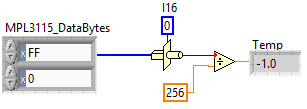 2, Das Vorzeichen ist nun im MSB, da wo es hingehört. Würde ich nun bitshiften würde ich quasi das Vorzeichen verschieben, was blödsinn ist und deshalb teile ich durch 256 was zur richtigen Skalierung führt und LabVIEW das Vorzeichenbit immernoch richtig erkennen lässt.