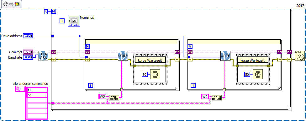 Zitat:Wenn ich eine längere Schleife erstelle(in meinen Fall ist "for-Schleife") werden nicht alle eingegebene Befehle ausgeführt. Aber wenn ich in den Blockdiagramm auf das Symbol mit der gelbe Lampe drücke dann und starte dann funktioniert alles tip top. Also muss ich hier iwie die ComPort Einstellungen verfeinern?