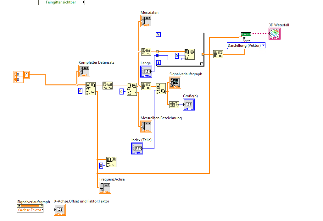 In der 1. Zeile steht die Frequenzachse. In der ersten Spalte meine Messreihen Bezeichnung. Diese beiden Datenreihen separiere ich erstmal um meinen reinen Datensatz zu erhalten. Das ganze Plotte ich dann über den Waterfall Plot-Helper (Darstellung Matrix) über den z-Matrix Anschluss.