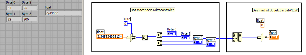 Ich habe z.B. eine float Zahl 2.345325. Diese ist 4 Byte groß. Jetzt übertrage ich zuerst von den 32Bit das Datenbit 0 bis 7. Anschließend das Datenbit 8 bis 15, dann 16 bis 23 und zum Schluß 24 bis 31.