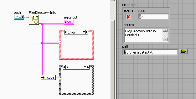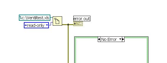 Beispiel...ist besser als bei ReadSpreadsheet, da müsstest du das Errorcluster nämich erst noch rausführen...alternativ ginge auch "open/create/replace file" und dann dort den Fehler abfragen...