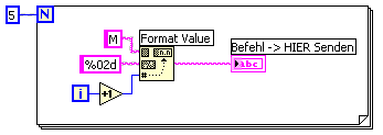 Zum Einfügen des Schleifenwertes hatte ich die Funktion "String Konvertieren" verwendet. Jetzt heißt es, die Zahl der angezeigten Werte soll zweistellig sein. Diese Funktion liefert aber führende Leerzeichen bei mehrstelliger Ausgabe. Wie Jens vorher im Beispiel zeigte, ist die Funktion "Wert Formatieren" angesagt. Hier bekomme ich die führenden Nullen, wie ich sie zur Steuerung des Digital-Multimeters benötige.