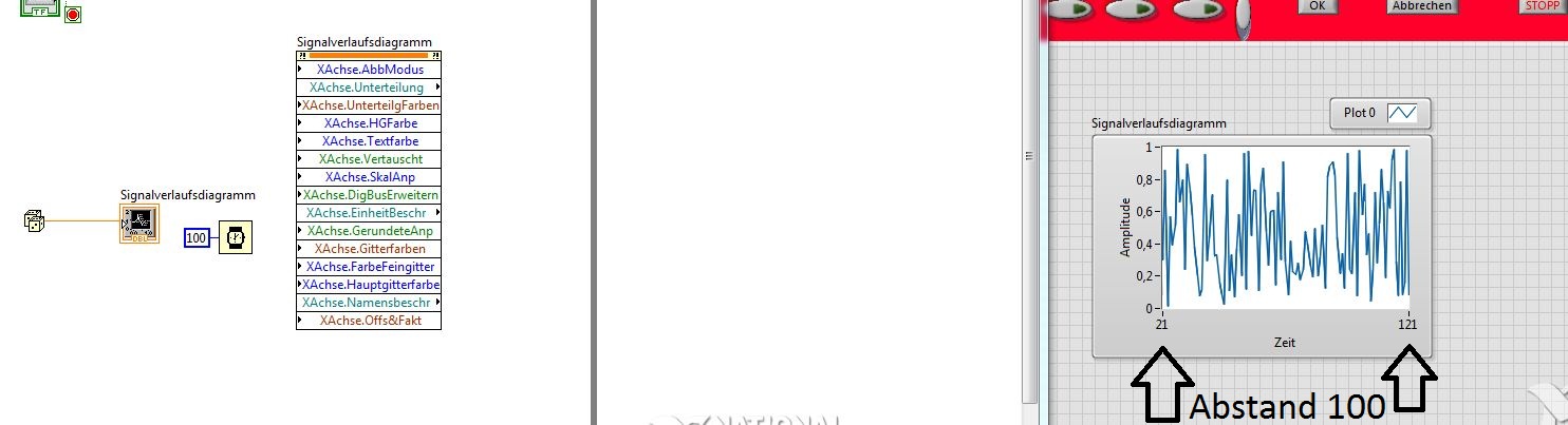 ich erzeuge Zufallszahlen alle 100ms in einer while-Schleife. Das Ergebnis zeige ich in einem Signalverslaufsdiagramm. Das signalverlaufsdiagramm füllt sich bis zum Endwert und dann werden die Werte immer weiter nach hinten geschoben, aber der Abstand bleibt immer 100. Wenn ich mit dem Mauszeiger an die Stelle tippe, wo z.B. die 100 steht und den Wert verändere, dann kann ich damit den Abstand verringern/vergrößern.