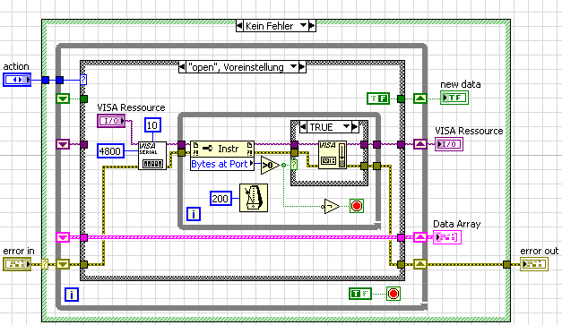 Vielen Dank für den Hinweis mit der action machine. Ich schau mir das gerade mal im Detail an: Du nutzt einen Eigenschaftsknoten, um die Anzahl der am Port vorhandenen Bytes auszulesen. Falls bei "open" welche vorhanden sind, löschst Du diese (wieso?). Bei "aquire" liest Du ebenfalls die Anzahl der Bytes am Port aus, und falls diese einen Grenzwert erreichen, führst Du VISA-Read aus und akquirierst die Daten. Ist es nach jedem VISA-Read-Befehl nicht notwendig, die Bytes am Port zu löschen oder geschieht das automatisch? Bevor Du VISA-Close ausführst, löschst Du ebenfalls nochmals alle Bytes am Port. Ist das zwingend notwendig?