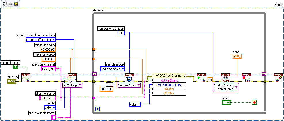 ich habe mal ein VI angehangen. Prinzipell ist es möglich Scanrate,Samples, Inputrange etc. während der Laufzeit zu ändern. Man muss sich nur eine Task vor der Mainloop generieren und diese dann in den Werten zu manipulieren. Wenn manipuliert wurde z. B. Scanrate geändert wird die Task zur Laufzeit gestartet, Daten abgeholt und danach wieder gestoppt und das ganze wieder von vorne. Nach der Mainloop wird die Task dann gekillt/aufgeräumt.