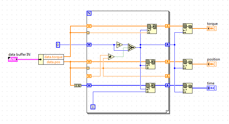 Anschaulich formuliert: bei einer Sample-Rate von 1 kHz für den Analogen Task bekommst du vom AI-Task ein n*1000 (n=Anzahl der Kanäle) Samples Array pro Sekunde zurück und vom Flanken-Zähler-Task bekommst du ein 1D-Array mit 1000 Werten, mit den Zähler-Ständen zum Sample-Zeitpunkt zurück. Damit kannst du im Rahmen deiner Auflösung im Post-Processing jeweils ein analoges Sample einem Zähler-Stand zuordnen, bzw. - wie oben bereits angedeutet - eine quasi-winkelsynchrone Abtastung (mit variabler Sample-Rate) ausrechnen. ==> also nix mit software-Timing oder Einzelwert-Abtastung ...