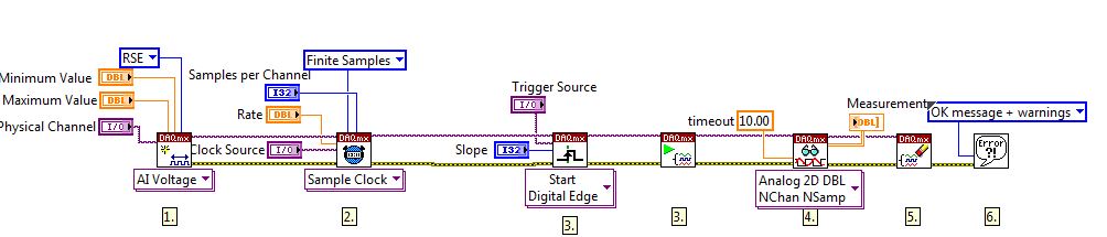Das wurschdelst du alles zusammen (ja, ist tricky ...) und du bekommst continuierliche DAQmx-Erfassungs-Tasks, der eine liefert dir die Spannungen vom analogen Eingang und der andere liefert dir SYNCHRON DAZU den Zähler-Stand des Flanken-Zähl-Tasks.
