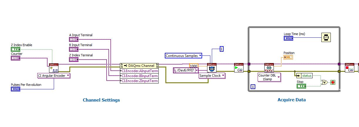 Mit DAQmx funktioniert das nahezu identisch: die Flanken des Encodersignals erzeugen einen Trigger (=Interrupt), der auf der DAQ-Karte intern verarbeitet wird, um damit die AI-Wandler zu starten…