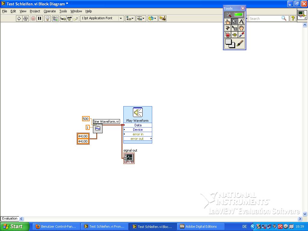 Ich probiers nochmal: anbei ein aktueller Test mit einem einfachen Sinus, den ich über meine interne Soundkarte abspielen möchte. Ich hör ihn auch, das passt, jedoch kann ich die Lautstärke nicht einstellen! Wenn ich die Amplitude ändere, von 1 bis 0,0000000001 oder wie auch immer, dann ändert sich zwar die Voltangabe in der grafischen Anzeige, jedoch nicht die zu hörende Lautstärke!