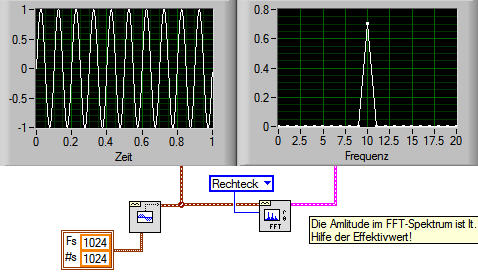Die Fourierfunktionen unter Signalverarbeitung/Signalverlaufsmessungen sind unendlich viel komfortabler, ich benutze grundsätzlich nur diese. Die kleine Mühe, einen 1D-Zeitverlauf gegebenenfalls in eine Waveform konvertieren zu müssen, lohnt sich auf jeden Fall. Man erhält mit diesen VIs genau die Ergebnisse wie man sie erwartet.