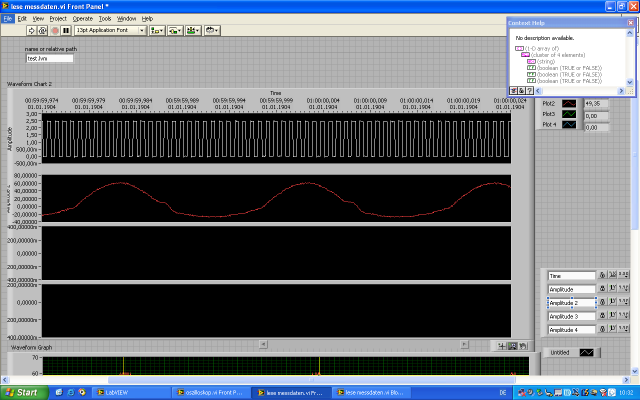 Ich nehem ja wie schon gesagt 4 Signale mit einem Oszilloskop auf, und übertrage die Werte via USB in mein LabView Programm. Dazu habe ich noch NI die VI's für die Agilent 6000 Series geladen und in mein Programm mit eingebaut.