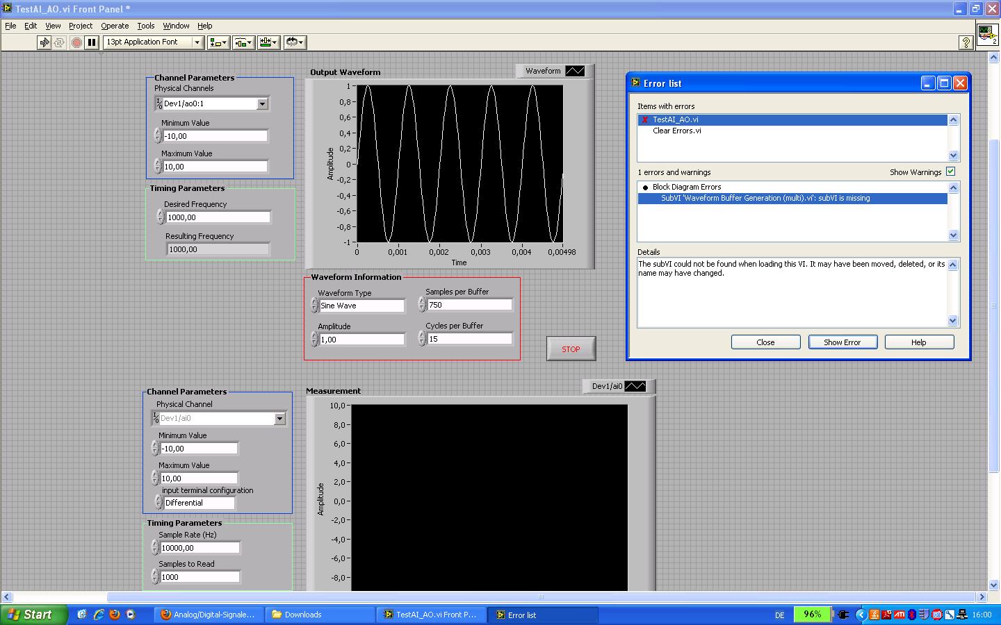 Ich habe versucht die Datei zu laden und es funktionierte auch am Anfang, allerdings wollte er dann eine SubVI namens 'Waveform Buffer Generation (multi).vi laden, die hier auf dem Rechner nicht zu existieren scheint. Beim Laden suchte er aber auch nach einem Verzeichnis von LV2010, kann es sein, dass Du die Datei damit erstellt hast und die Datei deswegen auf meinem LaVIEW 8.5 nicht zu finden ist? Ich habe die Fehlermeldung im Programm nochmal als Anhang mitgeschickt.