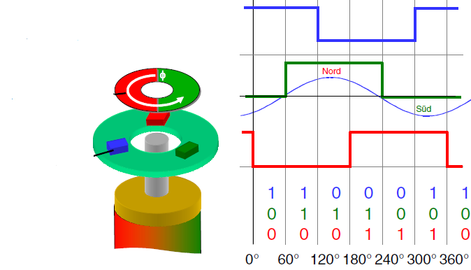 Dort sind in 120° jeweils 3 Hallsensoren in 40° zueinander platziert (siehe Anhang).