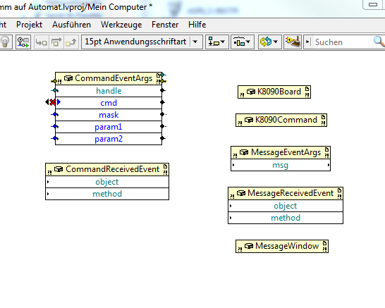 ich stehe vor dem gleichen Problem. Habe hier die gleiche Karte liegen und will diese jetzt in LV einbinden. Habe jetzt über Konnektivität/.NET/Konstruktorknoten alle Knoten eingebunden, die LV mir von dem K8090.dll treiber anzeigt. Das Bild habe ich unten mal eingefügt. Weiß nur nicht, wie es jetzt weiter gehen soll. Logisch denkend muss ich Labview überhaupt erst noch den richtigen Port zu weisen. Über M&AEX habe ich die Karte gefunden, doch wie binde ich das ganze nun ein?