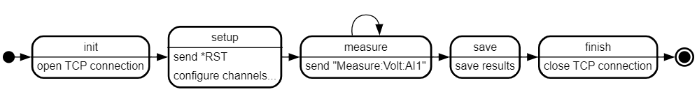 SCPI ist normalerweise eine sehr einfache API. Am Anfang schickst du alle Befehle zum Initialiseren und dann in einer Schleife deine Befehle zum Abholen der Werte.