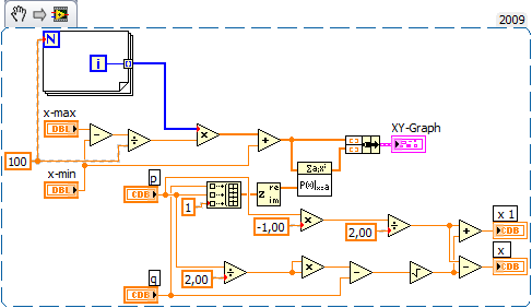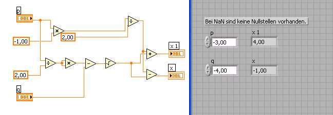 Die p-q-Formel kannst du mit den numerischen Elementen (Add, Wurzel,...) realisieren. Mach dir doch mal ein simples Beispiel mit Konstanten in LV. Am besten ein BSP, das Handschriftlich ganz einfach handschriftlich nachvollzogen werden kann.