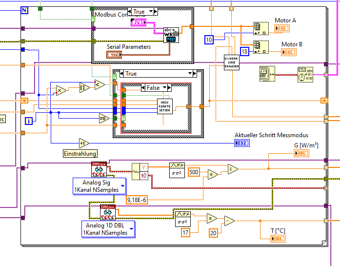 ich hab ein eher kleines Problem, zu dem ich bis jetzt noch keine passende Lösung gefunden habe. Ich habe eine VI die U-I-Kennlinien von PV-Modulen aufnimmt. Dazu rastere ich die Kennlinie in einer Schleife ab und messe jeweils U und I. Zusätzlich messe ich noch zwei Spannungen von einem Thermometer und einem Pyranometer. Diese Werte mittele ich und erhalte in jedem Schleifendurchgang einen Wert und am Ende der Schleife ein Array mit n Einträgen.