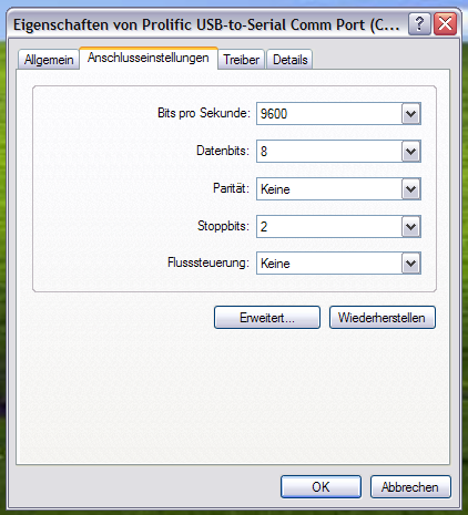 Mit Baudrate und Parity hab ich schon ein bisschen rumgespielt, geringer Baudrate und so. Aber keine Änderung.