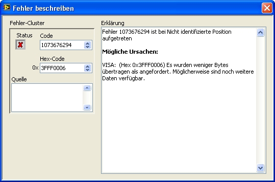 Hab soweit alles gemacht, was du geschrieben bzw. gepostet hast und nun bekomme ich den Fehlercode: 1073676294, Quelle: VISA: Lesen in Ansteuerung Escort3136A.vi!