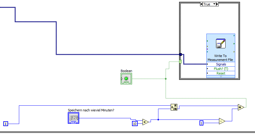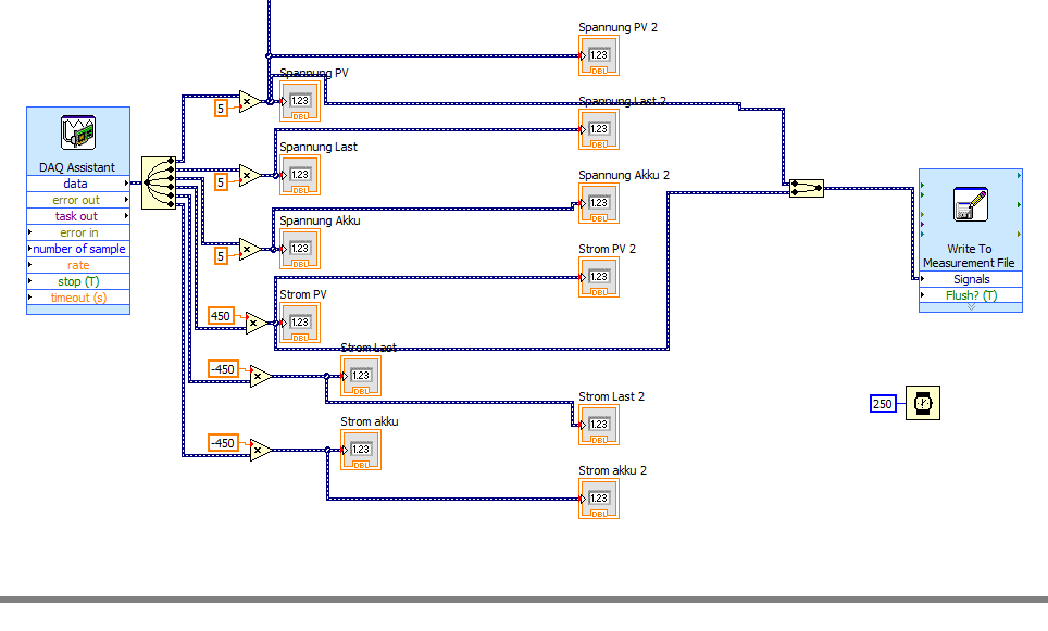 ich habe ein Versuchsaufbau mit dem ich analoge Spannungs und Stromwerte auslesen und speichern will. Nun habe ich das Problem, dass mit dem write to spreadsheet VI viel zu viele Werte gespeichert werden. Wenn ich zum Beispiel eine 20s Messung durchführe habe ich am Ende 4000 verschiedene Messwerte. Wie kann ich das reduzieren dass zum Beispiel nur alle 250ms ein Wert in die Exceltabelle eingelesen wird? Ein Versuch ist unten als Bild angehängt (funktioniert aber nicht so wie ich mir das vorgestellt habe).