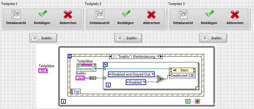 ich arbeite an einer Software für einen End of Line-Test. Es sollen beliebig viele Testplätze angelegt werden können. Deshalb stelle ich den Zustand eines Testplatzes in einem Array dar, welches beliebig erweitert werden kann. (Siehe angehängtes VI LV 2010) Auch die Bedienelemente befinden sich in diesem Array (Datailansicht, Bestätigen und Abbrechen)