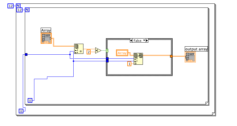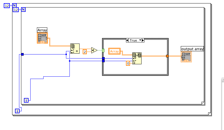 ich denke du solltest die Arrays außerhalb der Schleifen legen. In der ersten Schleife wählst du dann aus dem gesamten Array nur die erste Zeile und in der zweiten Schleife vergleichst du die Werte. Beim "betreten" des Arrays in eine Schleife wird automatisch nur ein Wert gelesen, das kannste mir Rechtsklick auf den Knoten ändern, falls erforderlich. Denke dann sollte das klappen, kanns leider nich auf die Schnelle ausprobieren da ich nur LV 7.1 habe.