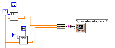 Die Filterung über das Subvi funktioniert soweit, nur hänge ich an der Weiterverarbeitung der gefilterten Werte zu einem Diagramm oder/und XY Graph.