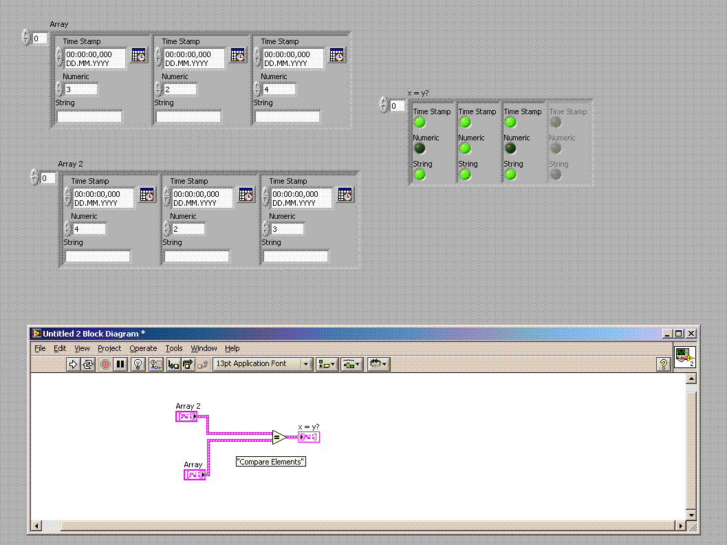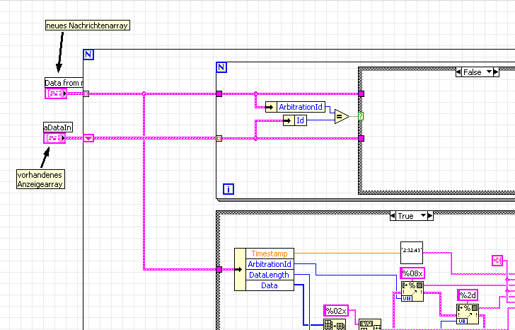 Hintergrund ist folgender. Ich bekomme von einem VI ein Array mit Nachrichten (= Cluster). Die Nachricht beinhaltet Zeitstempel, Nachrichten ID und die Daten selbst. Diese Nachrichten will ich anzeigen aber nicht alle, sondern wenn eine Nachricht mit dem ID kommt, das schon in meinem Anzeigearray vorhanden ist, soll die die vorhandene ersetzen, wenn aber keine solche Nachricht im Anzeigearray existiert, wird diese dem Anzeigearray hinzugefügt.