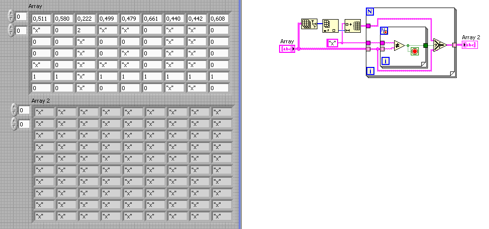 In meinem Vis möchte jede Zeile des Ursprunlichen Array mit X befüllen, falls in der entprechenden spalte einen Wert ungleich x gefunden worden ist.
