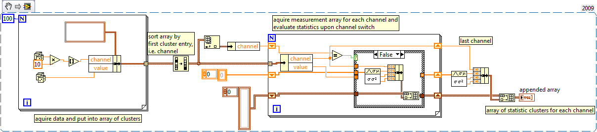 Außerdem kannst du ganz am Anfang die Zusammenführung der beiden Channel und Value Arrays am Anfang sehr viel direkter mit auto-indexing lösen, also einfach direkt beide Arrays in die For-Schleife geben und die auto-indizierten Werte Clustern. Dann brauchst du dein N nicht bestimmen und musst keine pseudo-Laufindexe (dieses Shift-register +1) erzeugen (welches auch direkt über den Laufindex i unten links funktioniert hätte Wink)).