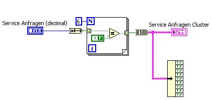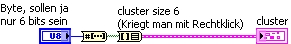 Ich hab ein Cluster mit 6 Boolschen Elementen. Je nachdem welche aktiviert werden kommt eine andere dezimal Zahl heraus. Jetzt wollte ich eine dezimal Zahl in ein Boolsches Array umwandeln und das in ein Cluster um den 6 Boolschen Elementen im Cluster ein Wert zuweisen. Mein Problem ist jetzt das bei der Umwandlung von Array zu Cluster die Dimension sich ändert bzw. einige Werte neu dazukommen. Wie ist das möglich? Leider gibts bei Cluster nicht die Option wie bei Arrays ein Teilbereich zu lesen.