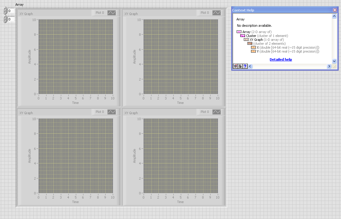 ... kann ohne Probleme ein array of Image displays erzeugen und verwenden. Daraufhin dachte ich, das geht mit allen Indicatoren. Der Versuch ein Array von XY-Graphs zu erzeugen ... endetet in der Verweigerung von LV. Sprich ich konnte den Indicator nicht in ein leeres Arrayfeld ziehen.