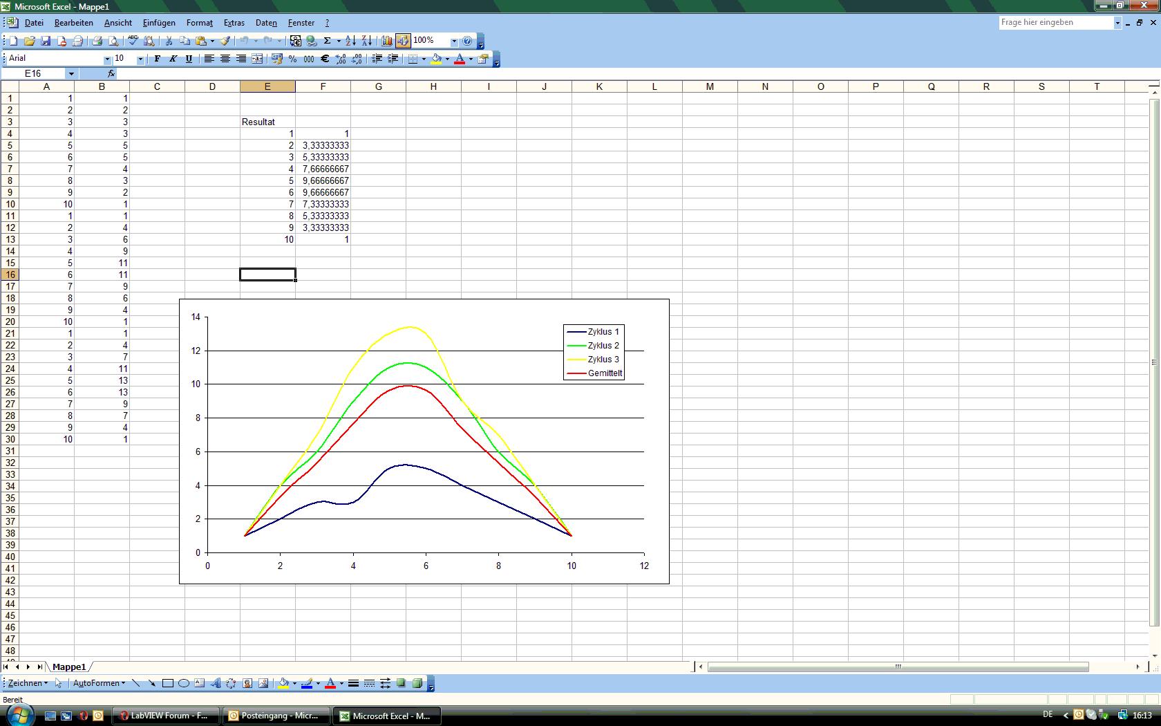 Im txt file lag nur ein Zyklus vor. Ich habe hiervon aber 160. Ich mag nicht den Mittelweit eines Zyklus', sondern die Werte für 0,0; 0,1; 0,2 etc aus allen Zyklen separat gemittelt, sodass wieder eine Kurve entsteht, die jedoch keine Spitzen (die vielleicht durch Messungenauigkeit entstanden) mehr aufweist. Anbei ein exemplarisches Excel-Beispiel: Ich habe links drei Zyklen angelegt, auf der rechten Seite entstehen mittels einfacherer Excelfunktion die Mittelwerte, was dann ebenfalls als Graph ausgegeben werden kann.