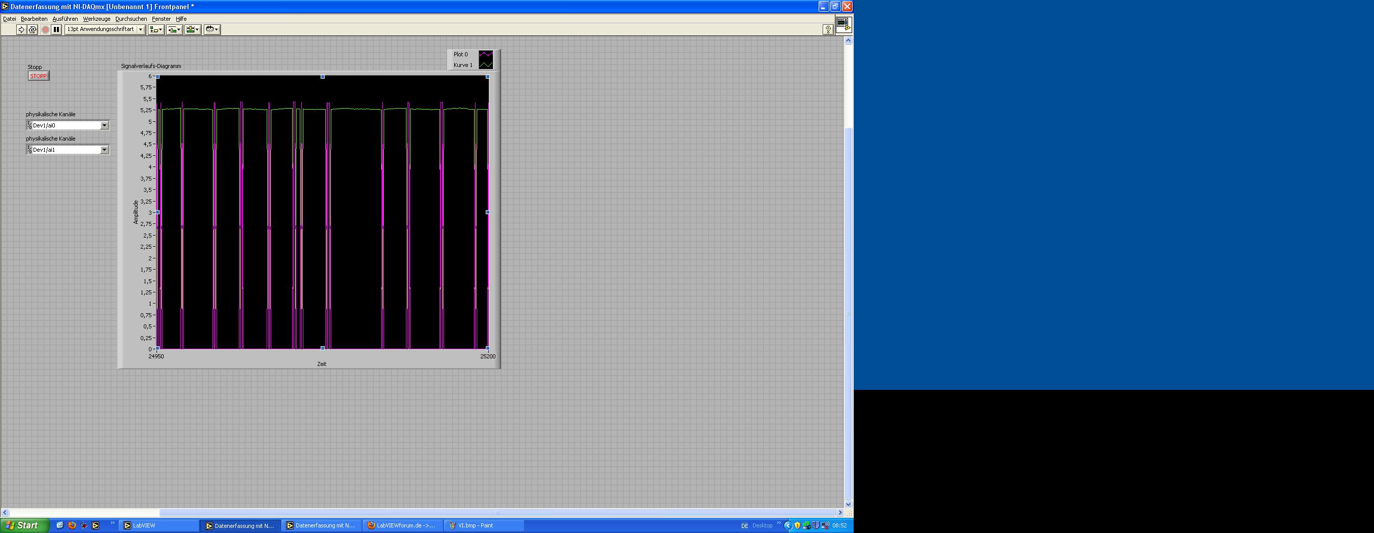 Ich soll mehrere Analogwerte aufnehmen und darstellen. Wenn ich 1 Analogwert aufnehme und darstelle funktioniert das so wie es sein soll. Sowie ich aber einen zweiten Wert mit aufnehme sehe ich von dem 2. Signal nur kurze Spitzen in meinem Diagramm. Habe beide Signale auf 5V gelegt und sollte dann doch eigentlich 2 Linien bei 5V dargestellt bekommen.