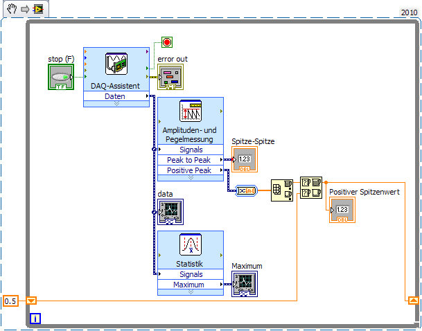 Ein Wechselspannungssignal soll eingelesen und das Maximum ausgegeben werden. So; mit C++ wäre das ziemlich einfach. In LabView finde ich es aber etwas schwieriger. In C++ würde ich einfach eine Variable deklarieren, in diese dann vom ersten Puls das Maximum hineinschreiben und wenn ein Puls ein höheres Maximum hat die Variable mit diesem Wert neu verknüpfen.