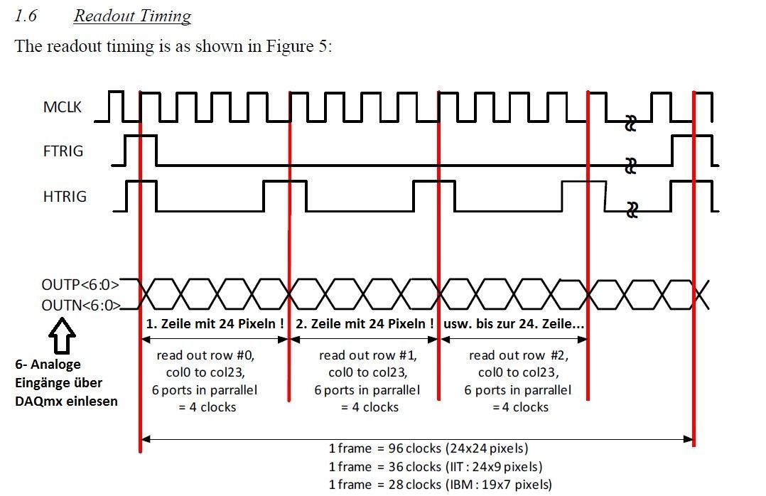 Ich möchte den Bildsensor einer Kamera auslesen, der Sensor hat 24x24 Pixel und unterscheidet nur Intensitätswerte, die er als Analogspannungspegel zu je einem 6er Block ausgibt und den ich dann mit dem NI USB-6341 Interface einlesen möchte.