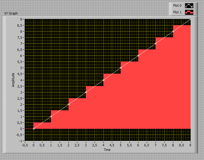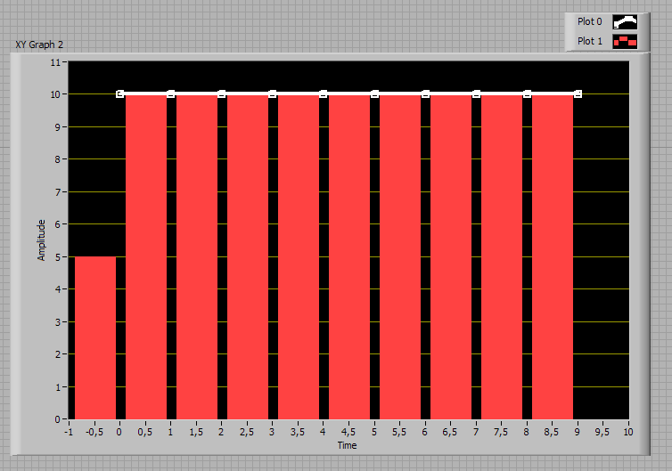 Rot dargestellt sind die Rechtecke, die die LabVIEW-Integral-Funktion bei Verwendung der Trapezregel aufaddiert, wenn man die Initial Condition auf dem Default-Wert [0] belässt. (Die Darstellung stimmt nicht ganz, da sich die Rechtecke berühren müssen, aber dann hätte man sie nicht mehr erkannt). Die numerische Integrations-Funktion gibt dir auch ein Array mit 10 Element zurück. Etwas unklar ist, was das Array-Element 0 darstellt. Ist es das Integral von 0 bis 0? Oder von 0 bis 0,5? Oder gar von 0 bis 1? Laut Hilfe soll es das Integral von 0 bis 0 sein. Wie man aber sieht, wird beim Default-Wert [0] eben noch eine Fläche von 5*1 dazu addiert.