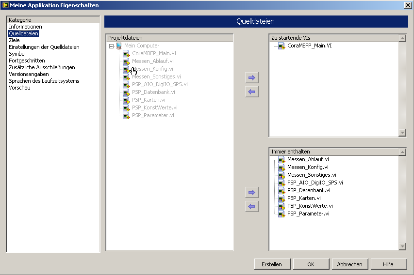 Hier die beiden Einstellungen, um VIs über VI-Server in EXE aufzurufen. Erstesten Bild: Projekt-Explorer. Alles mit "Messen_" und "PSP_" sind VIs, die über Server aufgerufen werden. Bei dir also deine 34 Relais-Programme. Diese Programme müssen genau an dieser Stelle im Baum stehen. Zweites Bild: Einstellungen Applikationbuilder. Beachte die beiden rechten Fenster. Oben das zu startende VI unten, die einzubindenden.