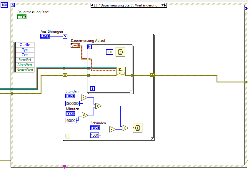 erstmal vielen Dank für deine Antwort, ich denke das könnte der richtige Ansatz sein. Allerdings ist mein Dauermessung-Aufbau mmn derzeit nicht dafür geeignet. Beim letzten Ansatz des QMH habe ich die Vorgänge direkt in der Event-Struktur in die Queue eingefügt. Wenn ich nun aber den Vorgang mehrmals ausführen möchte, verändere ich die Anzahl der Schleifenausführungen und passe die Wartezeit an (Stunden, Minuten, Sekunden). Somit läuft diese Schleife eine bestimmte Zeit (was ja auch alles andere als optimal ist in der Event-Struktur). Selbst wenn ich jetzt eine Reihe von "Warten (1s)" Vorgängen habe - die am Anfang eingefügten Vorgänge werden erst bei der nächsten Ausführung erfasst und ausgeführt.