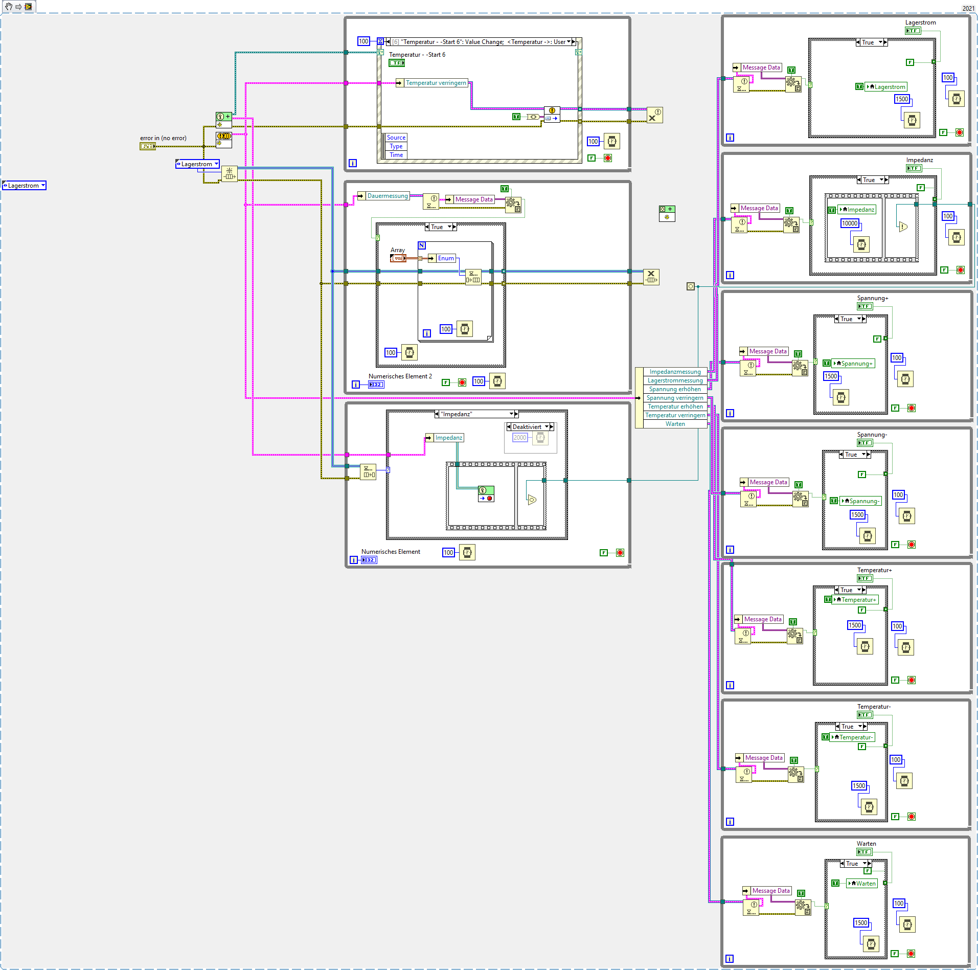 Um dies zu realisieren wählte ich zunächst den Ansatz einen Queued Message Handlers, indem ich die Queue mit Array Inhalten (bestehend aus einem Cluster mit einem Enum zur Schrittauswahl, einem Integer zur Auswahl Anzahl und einem Integer zur Auswahl der Wartezeit) fütterte. Dieser Ansatz funktioniert auch ziemlich gut, bis auf einige Funktionen, die dadurch nur bedingt möglich sind. Und zwar: mein größtes Problem ist, dass die einzelnen Messungen (Lagerstrom/Spannungsmessung, Impedanzmessung) und die anderen Vorgänge während der laufenden Dauermessung nicht einzeln ausgeführt werden können, auch wenn sie nicht verwendet werden. Mir ist natürlich klar, dass das aufgrund der Casestruktur so ist, also habe ich zunächst versucht bei den Einzel-Events die Schritte mittels "Element vorne einfügen" in die Queue zu füttern. Das funktioniert zwar, jedoch wird der Vorgang erst ausgeführt, wenn der aktuelle Vorgang fertig ist (falls eine längere Wartezeit geplant ist - unbrauchbar). Ich habe alles nach Antworten durchgesucht und auch die LabVIEW Core 1-3 Learnpaths durchgemacht, ohne eine bessere Idee zu finden als die, die ich heute aufgebaut habe.