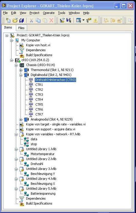 Für die Messungen an einem Elektro-Gokart habe ich in LabVIEW folgendes Projekt mit entsprechenden VIs geschrieben:
