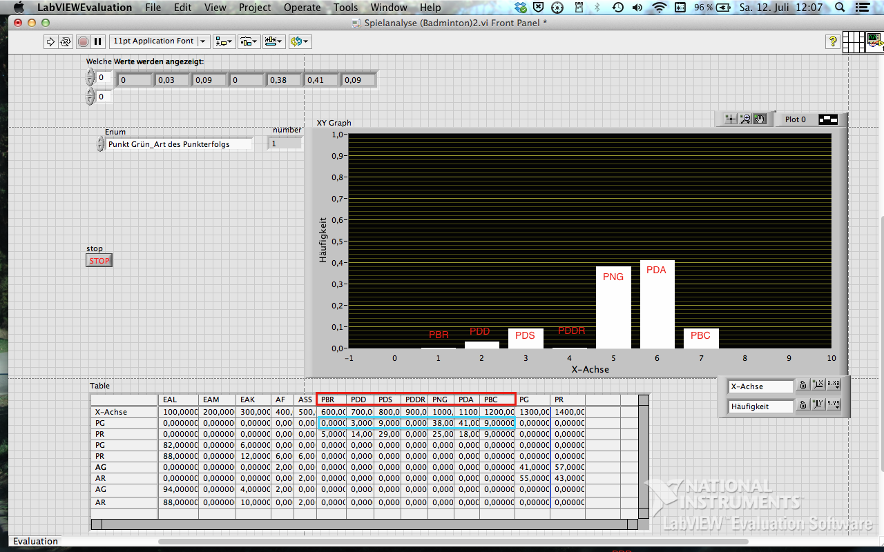 Mein Ziel ist es eine Tabelle von verschiedenen Wahrscheinlichkeiten aus einem analysierten Badmintonspiel (siehe Anhang) einzulesen und verschiedene Zeilen/Spalten mit unterschiedlicher Länge aus dieser Tabelle auszulesen. Dies hab ich bis jetzt auch hinbekommen. Dabei lese ich die Zeilen die man sich gerne anzeigen möchte mit Hilfe eines Enum aus. Die Tabelle lese ich als Textdatei ein. Jetzt möchte ich aber gerne noch die Balken mit dem jeweiligen Kopf aus der Tabelle in dem XY-Graph beschriften (siehe screenshot). Hat evt. irgendjemand ein Tipp wie man das machen könnte?