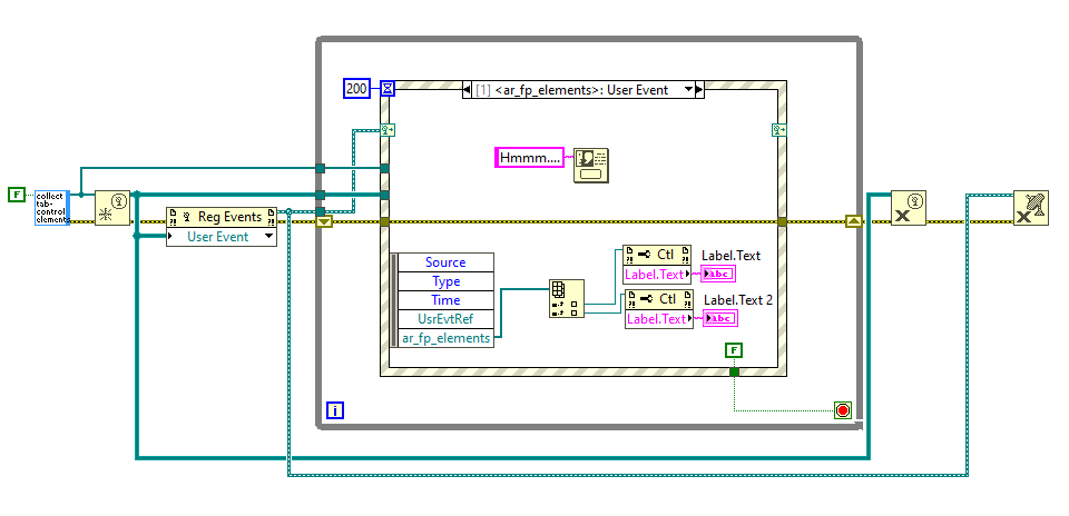 Ich habe in meinem Programm viele Bedienelemente (zum Einstellen von Parametern eine Messgerätes). Wenn der Nutzer einen Parameter ändern möchte, verstellt er ein Bedienelement und damit wird dann ein Parameter im angeschlossenen Messgerät verändert. Im Frontpanel sind die Bedienelemente nach Gruppen in einem Tabcontainter gruppiert. Eine Lösung dafür wäre pro Parameter (=Bedienelement) ein Event-Case zu erstellen und dann den entsprechenden Parameter an das Gerät zu senden. Bei 50 Parametern wird das mit den Event-Cases unübersichtlich.