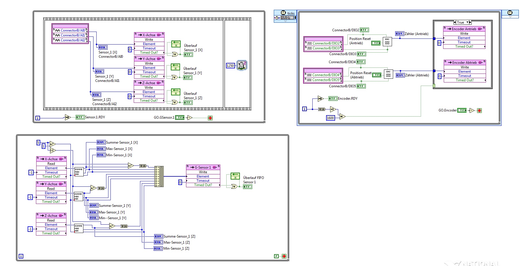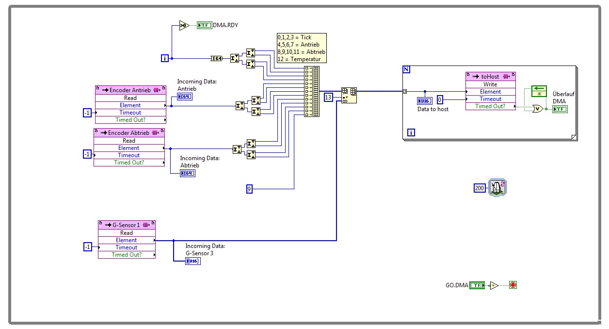 Ich habe bereits den Part auf dem FPGA versucht zu programieren, dieser funktioniert soweit, d.h. ich kann die Sensoren auslesen, und die Daten insgesamt ins DMA FIFO schieben. Im RT kann ich dieses FIFO auch auslesen, jedoch scheine ich hier noch etwas nicht ganz kapiert zu haben. Es kann sein das wenn ich das FIFO starten die Daten nicht auf der Position sind, wo sie sein sollten. Ich übertrage 3 x 64bit und 10 x 16Bit. Dadurch erkenne ich einen Versatz schnell. Wenn ich stoppe und wieder starte passt's dann oft. Zudem ist mir aufgefallen dass der mittgelieferte Counter bei 15Bit stehen bleibt.