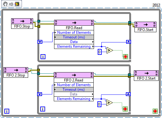 Laut der LabView Hilfe sollte die Fifo.stop Funktion ALLE Daten, HOST wie auch FPGA seitig im Fifo löschen, anschließend sollte die Reihenfolge meinem Verständnis nach deterministisch sein (es sei denn es kommt bereits zum Buffer-Überlauf vor dem ersten lesen). Das ist bei mir aber leider nicht der Fall.